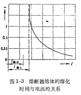 熔斷器的熔體從固態轉到液態直至汽化的過程通常叫做熔化過程,熔化過程的時間與電流的大小有關。電流愈大,熔化時間愈短。圖1-3所示為熔斷器熔體的熔化時間和電流的關系曲線。當電流逐漸減小到某一數值時,熔化時間就趨近于無窮大,達到這一數值的電流我們稱做最小熔化電流I最小。